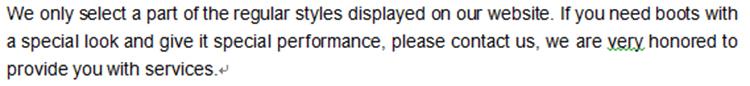 Ναι, θεωρούμε την ποιότητα των προϊόντων ως την πρώτη ζωτικότητα της ανάπτυξης της επιχείρησης. Οι μπότες μας είναι υψηλής ποιότητας. Χρησιμοποιούμε μόνο πρώτες ύλες που πληρούν τα διεθνή περιβαλλοντικά πρότυπα.